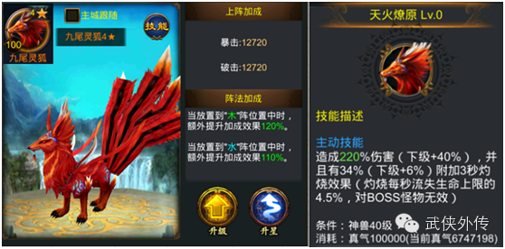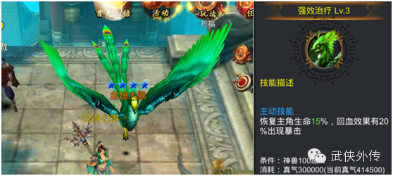 “混沌初开,天地交合,万物皆生。飞禽以凤凰为长,凤凰得交合之气,生下孔雀和大鹏。”这便是金翅大鹏的由来。“金翅大鹏”既擅攻杀,又具慈心。可为主角按百分比回复生命。攻杀征战,堪称神兽。